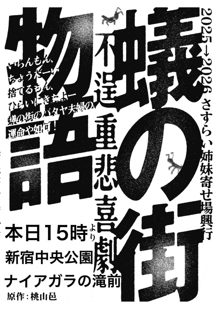 投稿日: 2025年12月31日2026年1月1日 投稿者: suizokukangekijou本日15時開演!さすらい姉妹「蟻の街物語」初日池袋にお越しくださりありがとうございました。寄場巡業2日目は新宿中央公園ナイアガラの滝前にて15時からスタートです。乞御期待!